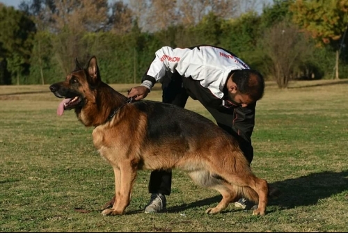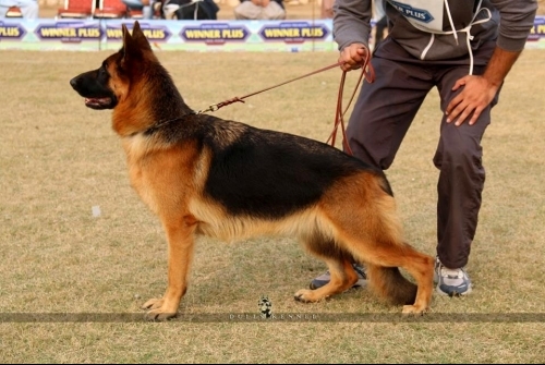 Big strong, substantial, strikingly typical and very expressive male. Dark eyes,Very good body body proportions, masculine head with a dark mask and more black on body.High wither, straight firm back, very good length and angle of croup.The shoulder is of correct length and angle with correctly laid-in-upper-arm.Hinds are very well angulated with broad thighs.Balanced forechest and brisket, clean front,perfect height to length ratio,dynamic movement.String heavy bone structure .Both on the walk and on the trot he moves at all times with very good presentation and very good general firmness. Positive strong nerves. |
