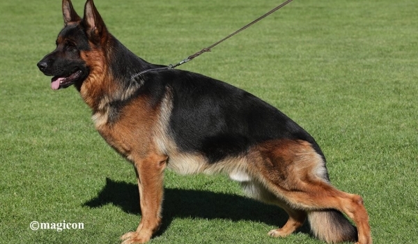 Large, medium strong, expressive, darkly pigmented, dry and solid male, with correct constitution. Strong head, high withers, straight back, long, pronounced well laid croup. Correct angulations, balanced chest proportions, straight front. Straight movement in the front and rear. Powerful harmonic movement. Steady nerves, TSB pronounced. |