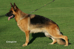 Medium-sized, medium-strong, anatomically very well built and very conspicuous bitch from her appearance. Very good, feminine head, very good lines, pronounced angulations and chest proportions. Straight step and step sequence, powerful, spacious corridors with free passage and powerful supplies. Essence sure, TSB pronounced. V. Anatomically very well built bitch with a very conspicuous type and appearance. |